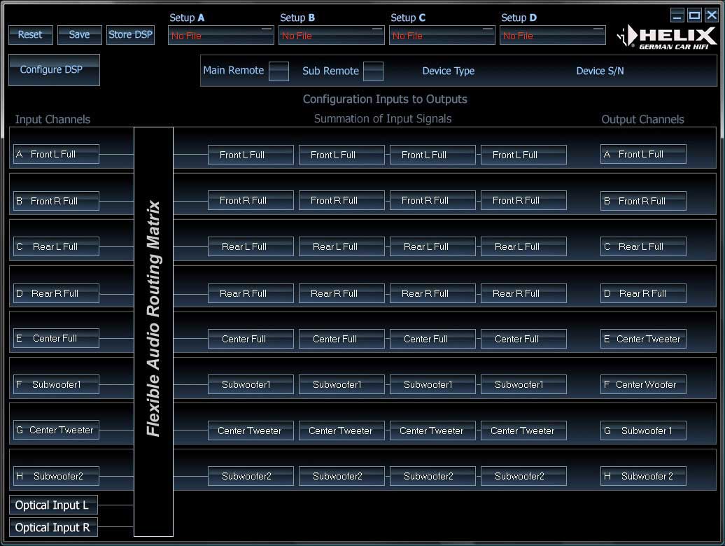 ハイレゾリューションの詳細は右のロゴをクリックかこちら HELIX P-DSPは簡単な接続で、最大8ch(フロント3way+サブウーファー)のアクティブディバイダーとして 使用できるプロセッサーです。入力はハイレベル(スピーカー出力)RCA入力、光入力に対応しています。 純正オーディオとの組み合わせには EASY PLUG CABLEが使用できます。(適合車種のみ) 純正オーディオからスピーカー出力と電源が簡単に取り出せます。A/D、D/Aコンバーターには高音質のバーブラウン製 を採用しています。そのため、112dB以上(デジタル入力時)107dB以上(アナログ入力時)のSNを達成しています。 調整はリニアに反映されるので、実際に試聴しながらストレス無く調整が可能です。